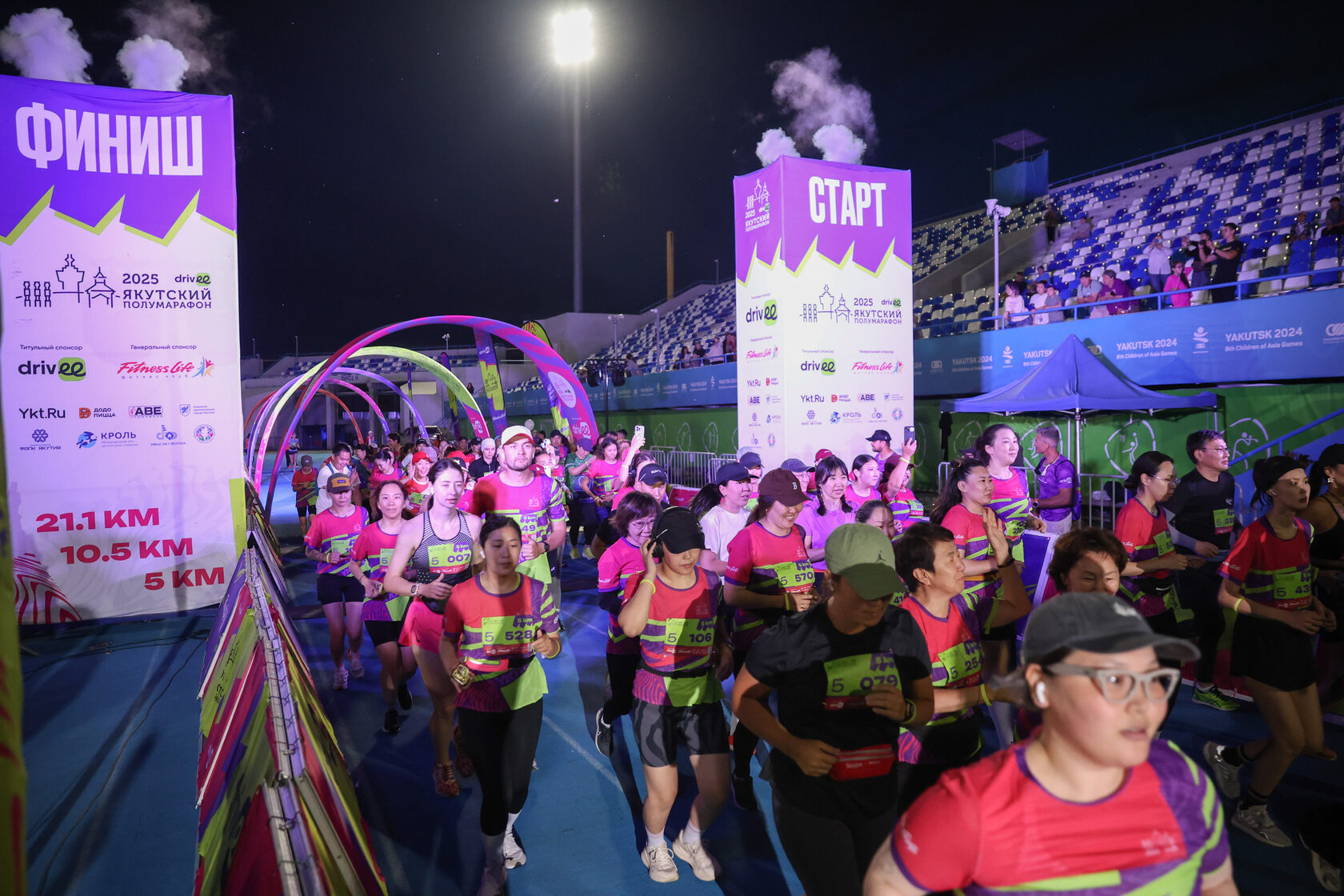 Ровно в 23:00 стартовали участники полумарафона (21,1 км). Следом выбегали бегуны на 10,5 км и 5 км. Все финишёры получили памятные медали с гербами якутских улусов — настоящий символ марафона.